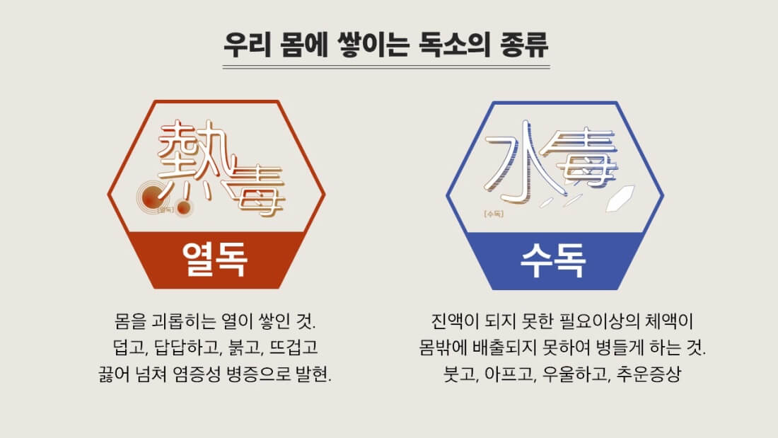 한의학의 독과 현대의 독(毒)은 개념이 조금 다릅니다. 독은 크게 열독(熱毒)과 수독(水毒)으로 구분을 할 수 있습니다
