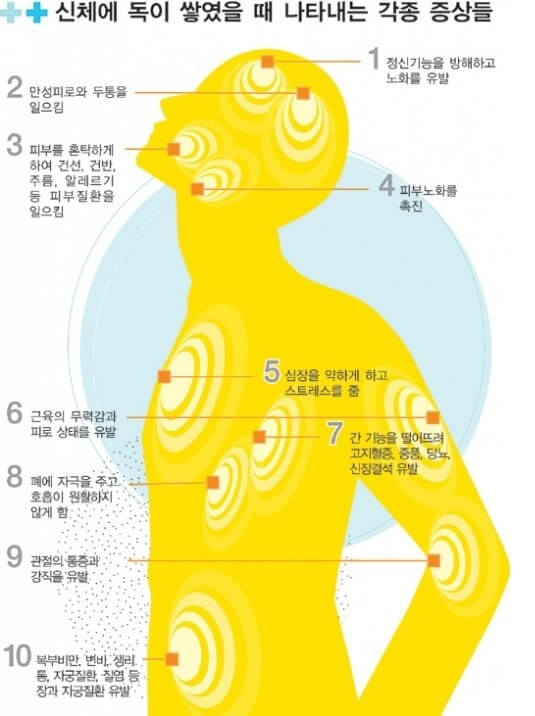 이러한 열독은 두통과 가슴앓이 및 수면장애, 안구 건조증 등과 신체 무기력증을 유발하고 원형탈모, 아토피, 건선, 여드름을 일으키는 원인이 됩니다.