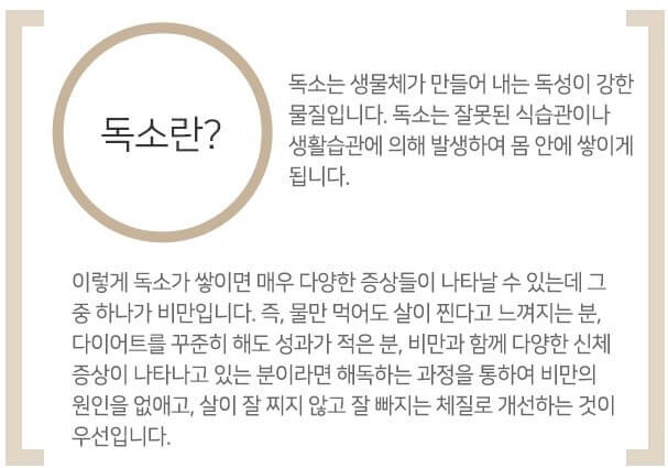 우리 몸의 수분은 소변, 대변, 땀을 통해 배출이 되어야 하는데 이러한 것이 제대로 이루어지지 않아 체내에 쌓여 독소로 남게 되는 것이지요. 수독은 위와 장의 흡수 기능을 방지하며 냉증, 부종 등을 일으키는 가장 큰 요인이 됩니다. 특히 장에 숙변 등이 쌓여 독소로 남았을 때도 이러한 증상들이 나타나며 장시간 서서 근무하는 직장인에게 잘 나타나지요. 물만 마셔도 몸이 붓고, 이러한 부종이 비만으로 이어지는 경우가 수독에 의한 비만 유형이며, 수독이 제거되면 피부도 맑아지고 몸의 신진대사가 원활해져 냉증과 부종이 없어지게 됩니다.