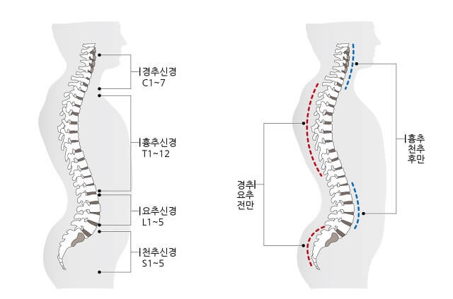 척추는 우리 몸의 중심을 이루고 기둥의 역할을 수행하는 기관으로 위쪽으로는 머리를 받치고 아래쪽은 골반과 연결되어 있습니다. 척추는 33개의 척추뼈로 구성되고, 척추뼈는 각각 경추 7개, 흉추 12개, 요추 5개, 천추 5개, 미추 4개로 구성되어 있습니다.
