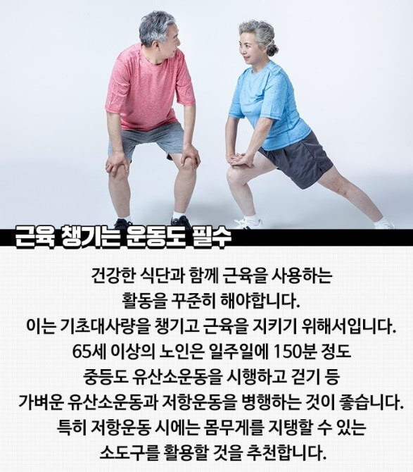 일반적으로 신체는 기초대사로 가장 많은 에너지를 소비하게 되는데 그중에 근육에서 소비되는 기초대사율이 평균 40%나 됩니다. 하지만 나이가 들수록 움직임의 횟수나 빈도가 감소하여 근육량이 줄어들 수밖에 없습니다. 기초대사율이 떨어지고 그 결과 비만해지게 됩니다.