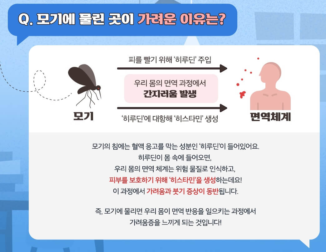 이는 모기의 침 때문에 발생하는 국소피부염증반응으로 볼 수 있는데, 일반적으로 가려움과 통증을 동반한 발진이 일어납니다. 모기의 타액 속에는 혈액이 굳지 않도록 만드는 항응고 물질인 히루딘 성분이 포함되어 있는데, 이 히루딘에 대한 알레르기 반응이 나타나면 *히스타민이라는 물질이 생겨나면서 피부 가려움과 부기가 발생하게 되는 것입니다.