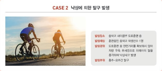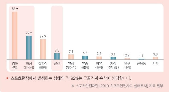 ② 또한, 본인이 좋아하는 스포츠 활동을 하면서 발생하여 신체의 일부분이 정상적인 기능을 하지 못하고 고통이 동반되며 치료를 하는데 일정 시간이 소요되는 모든 형태의 손상을 스포츠 손상이라고 지칭합니다.