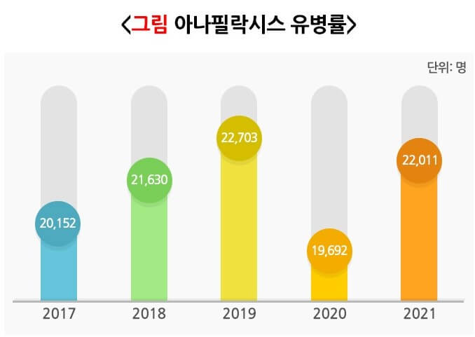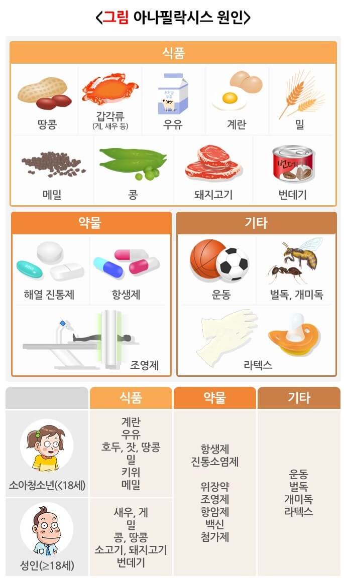 아나필락시스의 원인은 지역과 연령, 계절에 따라 다릅니다. 우리나라 소아 청소년에게는 식품이 가장 흔한 원인이며, 성인에서는 약물, 식품, 벌독, 운동 순서로 흔합니다.