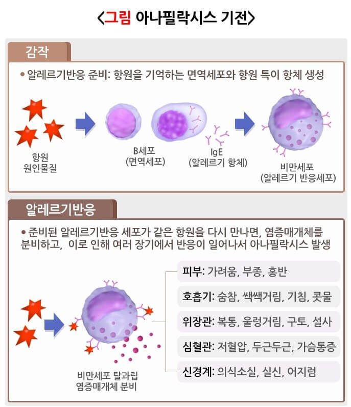 어떤 사람은 알레르기 반응이 신체 여러 부위에 빠르게 퍼져 나가면서 피부도 가렵고, 목안이 붓고, 숨도 차고, 어지럽고, 배가 아프거나 쓰러지기도 합니다. 이렇게 온몸의 여러 장기에 심한 알레르기 반응이 발생하는 질환을 아나필락시스(anaphylaxis)라고 합니다.