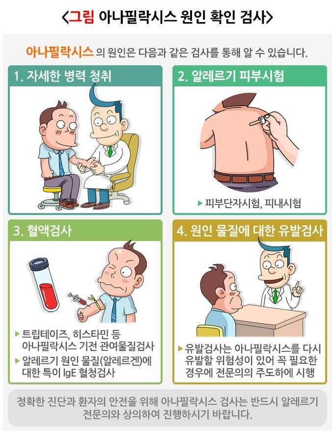 혈압과 산소포화도를 측정해 필요한 응급처치를 합니다. 혈액을 채취해 특정 원인에 대한 알레르기 항체(IgE)를 측정하거나, 피부반응검사를 통해 원인 물질을 확인합니다. IgE 항체를 통한 반응이 아닌 경우에는 원인 물질을 확인하기 위해 유발 시험을 할 수 있습니다. 유발 시험은 응급상황에 대처할 수 있는 병원에서 받는 것이 안전합니다. 감별해야 하는 질환으로는 급성 천식발작, 급성 전신 두드러기, 혈관부종, 심장 또는 뇌혈관의 문제로 인한 실신, 불안 및 공황발작 등이 있습니다.