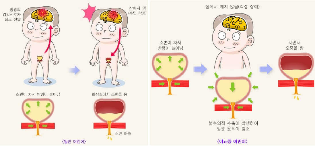 야뇨증(夜尿症)은 방광의 조절이 가능해야 하는 나이가 지났는데도 배뇨 조절 기능에 이상이 있어 오줌을 싸는 것을 의미합니다. 유아기에는 방광 기능이 불완전하여 단순히 반사에 의해 자동적으로 소변을 봅니다.