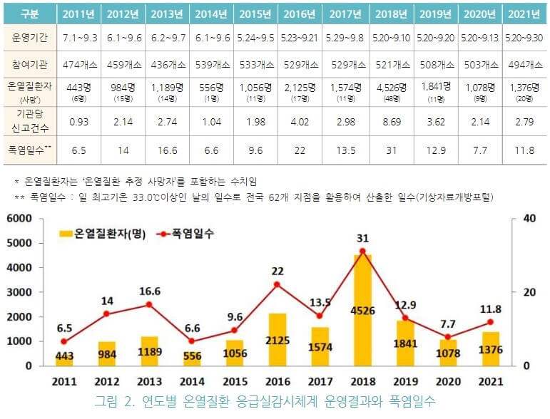 일반적으로 높은 온도에 노출되면 열사병, 열탈진, 부종, 땀띠, 경련, 두통, 무기력 등과 같은 증상이 나타날 수 있고, 심각한 탈수나 뇌혈관질환, 혈전생성에 영향을 미칠 수 있는 것으로 알려져 있습니다.