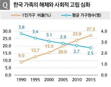 한국의 1인 가구 비율은 5년 주기로 3-4% p씩 증가하여 1990년 9.0%에 불과했던 1인 가구가 2000년에는 15.5%, 2015년에는 27.2%까지 상승했습니다. 1인당 평균 가구원 수는 1990년 3.8명에서 2000년 3.1명, 2015년에는 2.5명으로 급감하고 있는 것이 한국입니다.