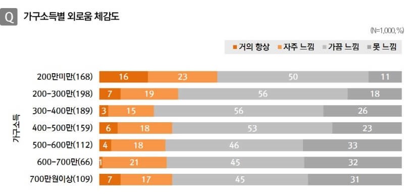 200만 원 미만 외로움 빈도 가장 높고, 월 가구소득 500만원 이상 외로움 벗어날 확률 높아졌습니다.