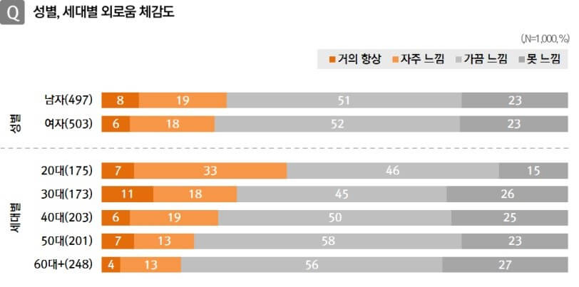 상시적(항상+자주)으로 외로움을 느낀다는 비율을 기준으로 보면 20대의 40%가 외로움을 느낀다(항상 7%+자주 33%)고 답해 가장 높았습니다.