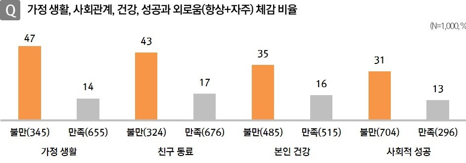 가정생활에 불만인 응답층에서는 외로움을 느낀다(항상+자주)는 응답이 47%인 반면, 만족하는 응답층에서는 14%로 낮았다. 또한 외로움을 빈번하게 느끼는 비율이 친구동료 관계에 불만인 사람들 중에서 43%, 만족하는 집단에서는 17%로 격차가 큽니다.