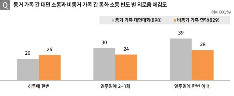 동거하는 가족구성원 간에 대면대화 빈도가 일주일에 한 번 이하로 대화하는 가정의 39%, 일주일에 2-3회인 가정의 30%가 잦은 외로움의 빈도가 높았습니다. 하루에 한번 꼴로 자주 얼굴을 마주하는 가정에서는 외로움 체감 비율이 20%으로 크게 낮아진 걸로 나타났습니다. 한편, 비 동거 가정에서는 주로 전화통화 등을 통해 소통하는 경우가 많은데 이 경우 통화회수에 따라 느끼는 외로움 체감도의 차이는 크지 않다. 직접 대면 소통의 중요성을 보여주는 결과이었습니다.