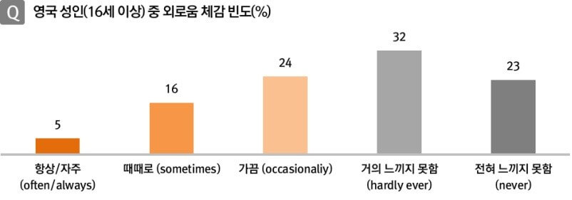 20명 중의 1명(5%)은 “일상화된 외로움” 호소 외로움에 대한 실태조사(Community Life Survey 2016-2017)를 발표했습니다. 영국 16세 이상 인구 중 45%는 정도의 차이는 있지만 외로움을 느끼고 있다고 합니다. 45% 중에서 5%는 외로움을 “항상/자주(always/often)” 느끼고 있다고 답했고, 16%는 “때때로(sometimes)” 외로움을 느끼고 있다고 답해 전체 국민의 21%는 적지 않은 외로움에 노출된 것으로 보입니다. 나머지 24%는 “가끔(occasionally)” 느낀다는 응답은 24%였다. 반면 외로움을 “거의 느끼지 않거나 전혀 느끼지 않는다(hardly ever 32%+never 23%)”는 응답자가 55%였습니다.