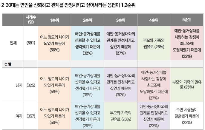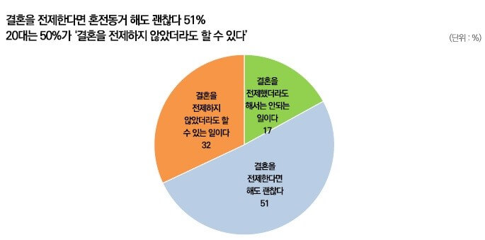결혼을 전제한다면 혼전동거 해도 괜찮다 51%. 20대는 50%가 ‘결혼을 전제하지 않았더라도 할 수 있다’.