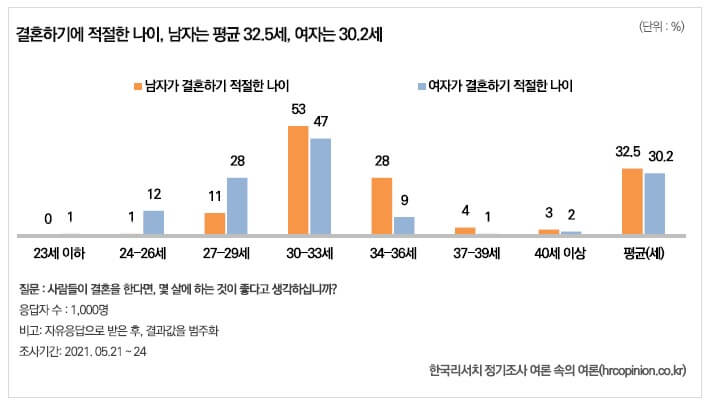 응답자들이 답한 나이를 평균한 남자의 결혼 적령기는 32.5세, 여자는 평균 30.2세였는데, 통계청에서 발표한 2020년의 평균 초혼연령(남자 33.2세, 여자 30.8세)보다 남자는 0.7세, 여자는 0.6세 어린 나이다. 남자의 결혼 적령기로 30대 초반(30-33세)을 꼽은 응답이 53%로 과반을 넘었고, 30대 중반(34-36세)이라는 응답이 28%로 뒤를 이었습니다.