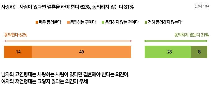 ‘사랑하는 사람이 있다면 결혼을 해야 한다’는 진술에는 62%가 동의해, 동의하지 않는다는 응답(31%)보다 높았습니다. 하지만 연령대가 낮을수록 동의한다는 비율이 낮아졌는데, 20대는 43%만이 ‘사랑하는 사람이 있다면 결혼을 해야 한다’ 고 답해 그렇지 않다는 응답(45%)과 차이가 없었습니다. 또한 남자(72%)보다는 여자(53%)가 ‘사랑하는 사람이 있다면 결혼을 해야 한다’고 답한 비율이 낮았고, 특히 20대 여성은 24%, 30대 여성은 35%만이 동의한다고 답했습니다.