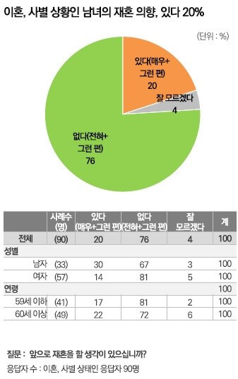 미혼 여성 중에서는 32%만이 ‘향후 결혼 의향 있다. 미혼 응답자 중에서는 48%가 향후 결혼 의향이 있다고 답한 반면, 35%는 결혼 의향이 없다고 답했습니다(잘 모르겠다 18%). 결혼 의향은 성별과 세대별로 큰 차이를 보였습니다. 미혼 남성 중에서는 61%가 향후 결혼 의향이 있다고 답한 반면, 미혼 여성 중에서는 32%만이 결혼 의향이 있다고 답했다. 20대 미혼 응답자 중에서는 56%가 결혼 의향이 있다고 답했으나, 연령대가 높아질수록 결혼 의향은 낮아졌습니다(30대 45%, 40세 이상 28%) 이혼 혹은 사별 상태인 응답자 중 재혼 의향이 있다는 응답은 20%에 머물렀습니다. 59세 이하 응답자 중에서도 17%만이 향후 재혼 의향이 있다고 답했습니다.