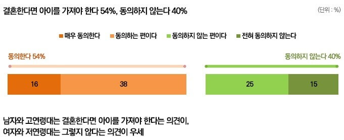 ‘결혼한다면 아이를 가져야 한다’ 는 진술에는 54%가 동의하였습니다.