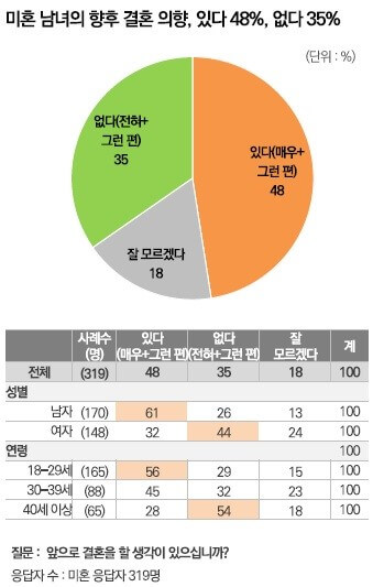 미혼 남녀의 향후 결혼 의향, 있다 48%, 없다 35%