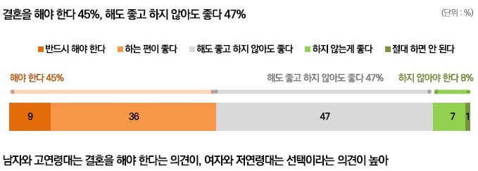 (반드시 해야 한다 9%, 하는 편이 좋다 36%). 반면 해도 좋고 하지 않아도 좋다고 답한 응답자는 47%였습니다. 결혼을 해야 한다는 입장과, 개인의 선택이라는 입장이 엇비슷하였습니다.