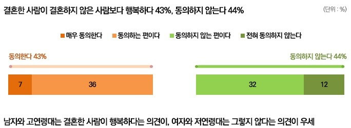 44%는 동의하지 않는다고 답했고, 13%는 의견을 유보하였습니다. 이번에도 성별과 세대별로 인식의 차이가 매우 컸습니다. 남자는 53%가 ‘결혼한 사람이 결혼하지 않은 사람보다 행복하다’는 데에 동의했고, 34%가 동의하지 않는다고 답했습니다.