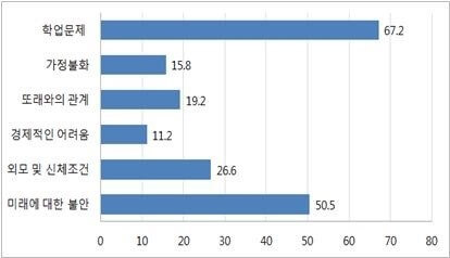 직업 선택에 대한 고민 또한 스트레스를 유발하는 원인이 되고 있다고 보고하고 있습니다. 또한, 청소년들은 학교라는 공동체 속에서 생활하는 시간이 많다 보니 학교 생활을 함께 하는 친구 · 선후배 · 선생님과 관계를 맺는 과정에서 스트레스를 가지게 되는 것으로 나타났습니다. 이 외에도 부모와의 원만하지 못한 관계, 거주지역에 대한 불만 등 환경적 요인이 원인이 되어 스트레스를 느끼는 것으로 보고하고 있습니다.