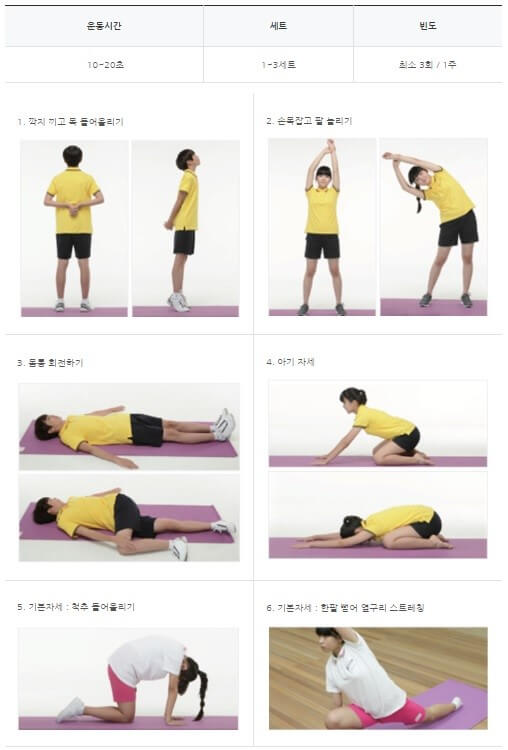 척추측만증 예방 및 개선을 위한 운동법 척추측만증의 예방 및 개선을 위해서는 우선 꾸준한 스트레칭과 함께 전신 균형을 잡아주는 수영, 걷기, 약한 강도의 근력 운동을 병행하는 것이 바람직하다.