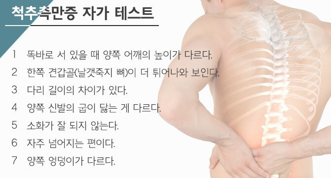 척추측만증은 옆에서 보았을 때 위와 같은 정상적인 굴곡 상태가 아닌 3차원적인 기형 상태로, 앞에서 보았을 때 옆으로 휘어 보인다. 척추측만증의 교정을 위해서는 척추 주위의 약한 근육을 강화시키고 만성적으로 수축된 근육들을 이완시키기 위한 운동이 요구된다.
