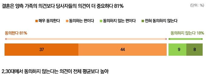 결혼은 양측 가족의 의견보다 당사자들의 의견이 더 중요하다 81%