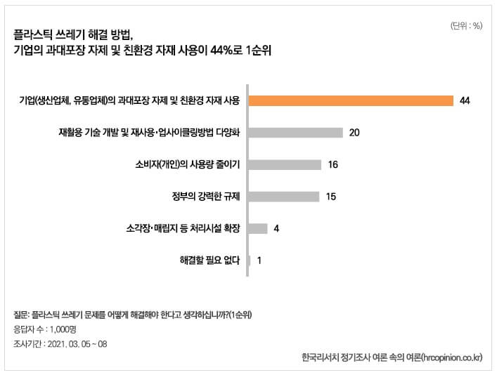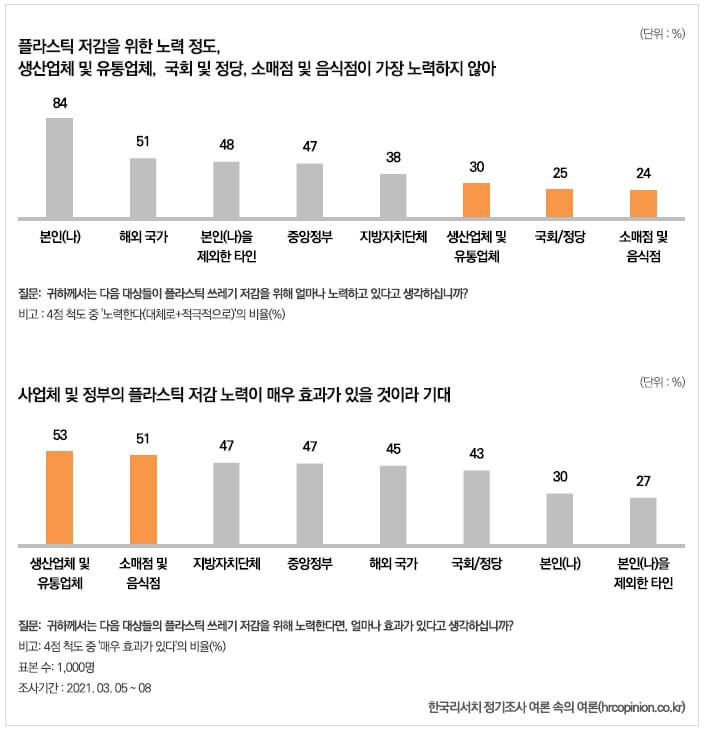 사업체의 과대포장 및 과다사용 때문 73% 사람들은 플라스틱 쓰레기 문제의 가장 큰 원인으로 플라스틱 상품을 만들고, 플라스틱 포장재를 사용하는 사업체를 지목했다. 플라스틱 쓰레기 문제가 왜 발생하는지 물은 결과, 사업체의 과대포장 및 과다사용이 원인이라는 답이 73%로(생산·유통업체 47% + 소매점·음식점 26%) 개인의 과다한 사용(12%) 및 정부 정책 미흡(11%)보다 훨씬 높았다. 같은 맥락으로 10명 중 8명은 제품의 플라스틱 포장재가 과도하다(79%)고 인식했으며, 46%는 소비 시 비플라스틱 제품을 고를 수 있는 선택지가 부족하다고 생각했다.